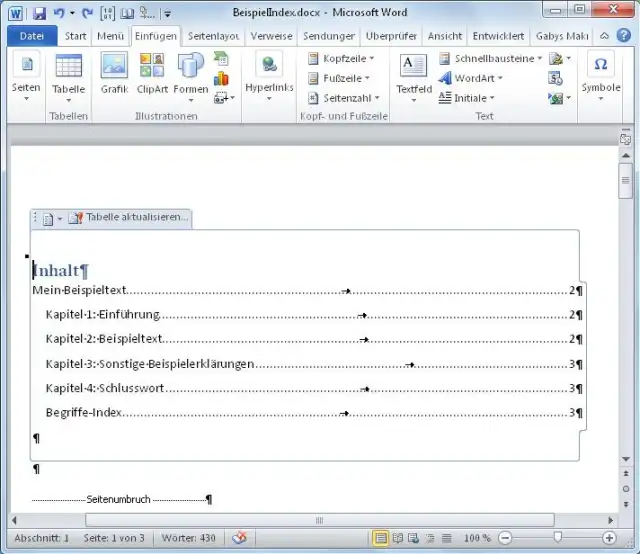 Etwa bei Word 2010 aktiviert sich immer gleich der Bereich mit «Tabelle aktualisieren», sobald Sie ins Inhaltsverzeichnis klicken. Was Sie eintippen, landet in diesem Bereich. Sogar eingefügte Seitenumbrüche schieben nicht etwa das Inhaltsverzeichnis nach unten, sondern fügen die Seite innerhalb dieses Bereichs ein.