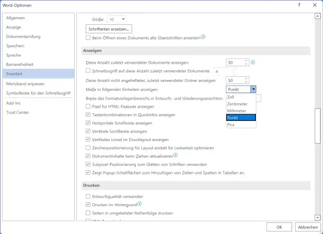 Öffnen Sie in Word Datei/Optionen und gehen Sie zu Erweitert. Scrollen Sie im rechten Teil um gut die Hälfte herunter, bis Sie zum Bereich Anzeigen gelangen.
