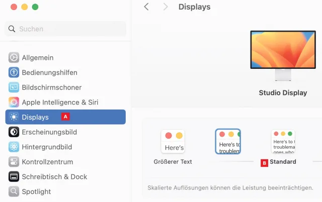 Normalerweise sorgt macOS aus eigenem Antrieb für die optimale Bildschirmauflösung, um eine makellose Skalierung zu gewährleisten. Das gilt auch, wenn ein anderer Abbildungsmassstab gewählt wird: In der Systemeinstellung Displays, Bild 1 A, legen Sie fest, wie das Verhältnis zwischen dem verfügbaren Platz und der Grösse der Benutzeroberfläche balanciert werden soll B.