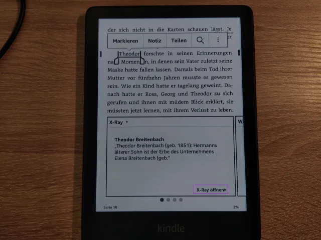 - Im geöffneten E-Book halten Sie den Namen einer Figur oder eines im Buch erwähnten Orts etwas länger gedrückt, um z.B. einen fiktiven Charakter zu markieren. Nebst den Optionen Markieren, Notiz oder Teilen sehen Sie unten eine Box mit Informationen zum markierten Text. In unserem Beispiel sehen Sie Informationen zur fiktiven Person Theodor Breitenbach. Unten rechts in der Box sehen Sie X-Ray öffnen. Tippen Sie darauf.