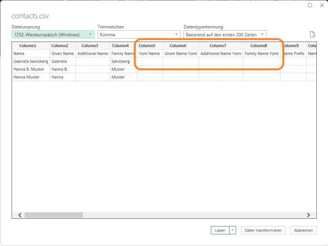 Auch die aus den Google-Kontakten exportierte CSV-Datei enthält mehrere Spalten mit Erwähnung von «Yomi»