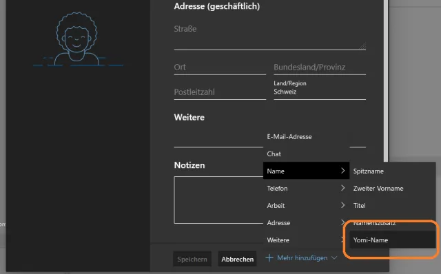 In der Web-Version von Outlook finden Sie Felder, die es im lokal installierten westlichen Outlook nicht gibt. Wenn Sie etwa einen Kontakt bearbeiten und bei den Feldern auf Mehr hinzufügen klicken, steht Ihnen auch ein Feld «Yomi-Name» zur Wahl.