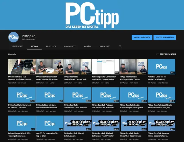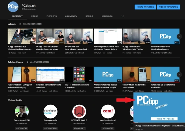 In YouTube ist es möglich, einzelne Kanäle zu abonnieren, zum Beispiel den PCtipp-Kanal: youtube.com/c/PCtippchannel/featured, Bild 1. Auch sonst ist das Abonnieren eine zentrale Funktion von YouTube. Damit folgen Sie Kanälen und erhalten deren Videos in Ihrer Abo-Inbox. Ganz hundertprozentig zuverlässig ist das leider nicht, da YouTube manchmal meint, es wisse besser, was der Nutzer sehen möchte. Also sollte man bei besonders wichtigen Kanälen jeweils auch noch «die Glocke» aktivieren. Das geschieht gleich neben dem Abonnieren-Knopf und aktiviert Benachrichtigungen für den spezifischen Kanal.
