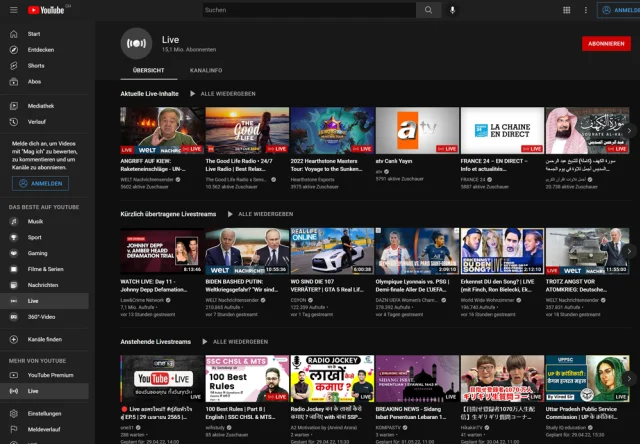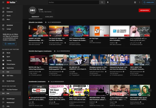 Gute Nachrichten: Falls Sie kürzlich Ihren Fernsehanschluss gekündigt haben und doch einige News-Programme vermissen, ist das kein Problem. Viele bekannte News-Kanäle zeigen ihr Programm auch auf YouTube. Vor allem TV-Sender, die sowieso schon im öffentlichen Fernsehen verfügbar sind, nutzen die Plattform gern. Dazu kommen die Videoteams von grossen News-Webseiten, die sonst keine TV-Präsenz haben, und natürlich auch viele kleine News-Outlets. Die Qualität variiert wie sonst auch auf YouTube von hochwertigen Programmen bis zu Mist.