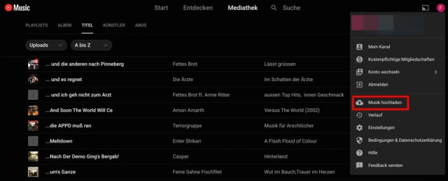 - Klicken Sie danach unter Mediathek auf Titel und wählen Sie im Dropdown-Fenster Uploads aus. Dort finden Sie den Track.