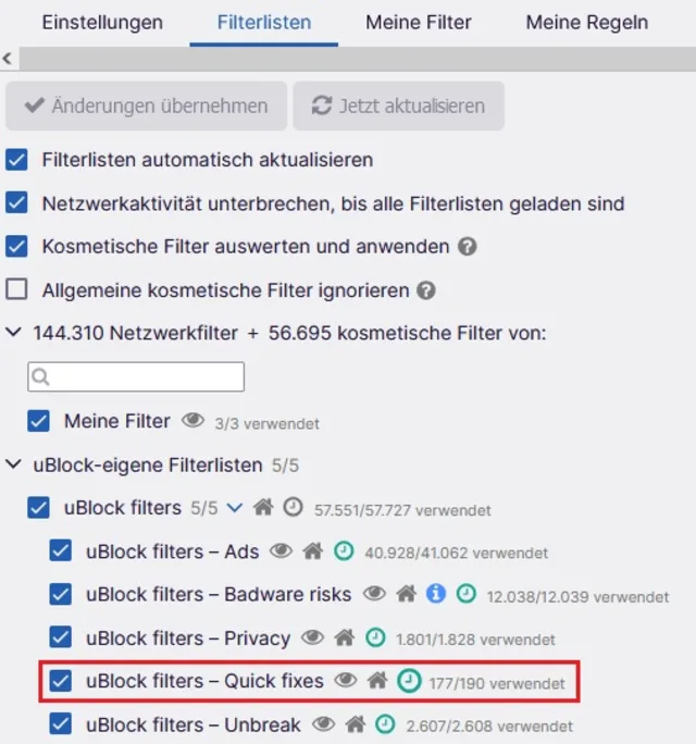 Bild 8: Ein Update der «Quick fixes» von uBlock Origin blendet Werbung wieder aus