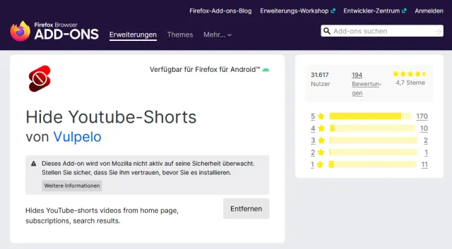 Gelegentlich blendet YouTube eine Leiste mit «Shorts» ein. Das sind kurze Filmchen, mit denen Google dem beliebten Videodienst TikTok Konkurrenz machen will. Sie können die Leiste jedes Mal über das «X» rechts oben wegklicken oder eine Browsererweiterung installieren, die das für Sie übernimmt. Firefox-Nutzer verwenden dazu das Add-on namens Hide Youtube-Shorts, Bild 10, die Anwender eines Chrome-basierten Webbrowsers nehmen den ShortsBlocker.