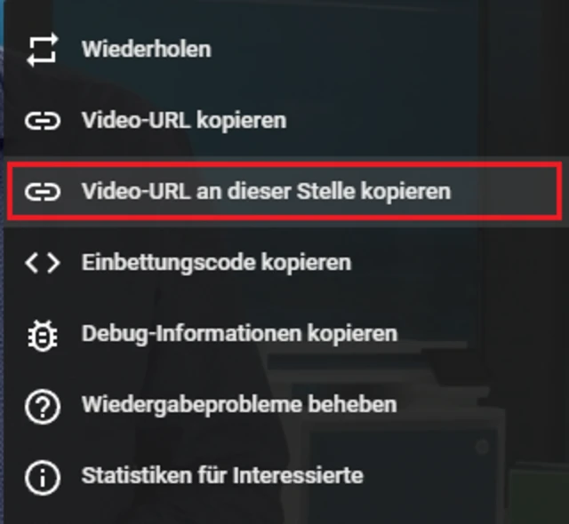 Die URL eines YouTube-Videos übernehmen Sie per Rechtsklick sowie Video-URL kopieren in die Zwischenablage. Danach können Sie diese zum Beispiel mit Ctrl+V in eine neue E-Mail einfügen. Es ist auch möglich, einen Link zu erstellen, der genau auf eine besonders interessante Stelle des