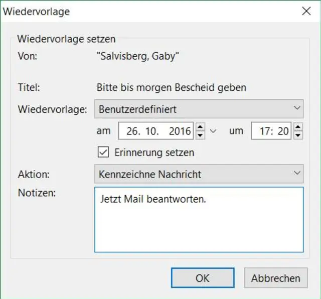 Ihre Kollegin schickt Ihnen eine Mail, die Sie bis zu einem bestimmten Zeitpunkt beantworten sollen. Vielleicht ist es eine Einladung zu einer Veranstaltung, zu der Sie sich noch anmelden sollten. Sie haben im Moment keine Zeit, sich der Mail im Detail zu widmen, aber Sie wollen sich kurz vor Ablauf der Anmeldefrist nochmals damit befassen.