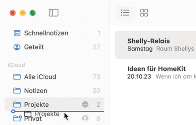 Wählen Sie im Menü Ablage den Befehl Neuer Ordner, um die Notizen zu gruppieren. Doch da geht noch mehr: Wenn Sie einen Ordner in der Seitenleiste auf einen anderen Ordner ziehen, Bild 5, erstellen Sie eine verschachtelte Hierarchie – ganz wie im Finder.