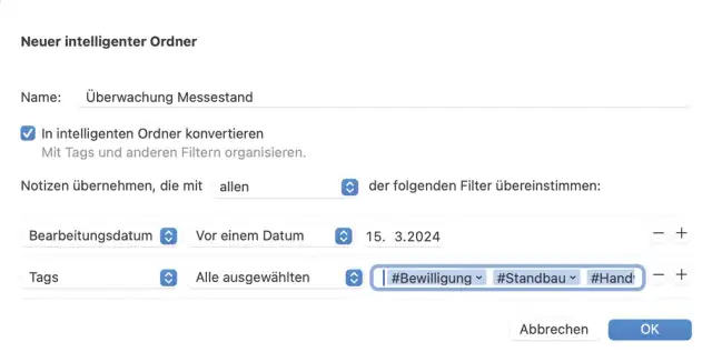 Falls selbst Tags noch nicht genug sind oder Sie bestimmte Suchabfragen immer wieder benötigen, wählen Sie im Menü Ablage den Befehl Neuer intelligenter Ordner, Bild 7. Hier gibt es kein Halten mehr: Definieren Sie zum Beispiel eine Abfrage für alle Notizen, die das Tag #Messe tragen und seit mehr als einem Monat nicht mehr verändert wurden. Der Inhalt des Ordners ändert sich dynamisch, wenn eine Notiz neu das Kriterium erfüllt – oder eben nicht mehr.
