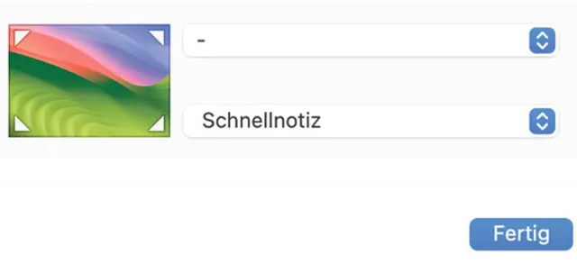 Wenn Sie eine andere Ecke bevorzugen oder die Funktion sogar abschalten möchten, klicken Sie in der Systemeinstellung Schreibtisch & Dock ganz unten auf die Schaltfläche Aktive Ecken, Bild 3. Oder wie wäre es mit einem Kurzbefehl? Öffnen Sie die Systemeinstellung Tastatur und klicken Sie auf die Schaltfläche Tastaturkurzbefehle. Markieren Sie anschliessend in der linken Spalte den Eintrag Mission Control und teilen Sie der Schnellnotiz ein eigenes Kürzel zu.