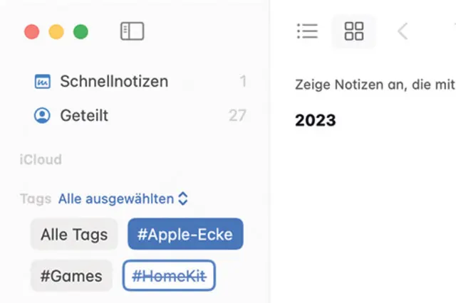 Quelle: PCtipp.chSobald ein Tag verwendet wird, erscheint es in der linken Seitenleiste. Wenn Sie ein Tag anklicken, sehen Sie nur noch die Notizen, die es enthalten, Bild 6. Ein zweiter Klick zeigt jene Notizen, die es nicht enthalten. Und mit dem dritten Klick wird dieser Filter wieder aufgehoben. Mehrere dieser Filter wirken wie eine UND-Bedingung: Zeige mir alle Notizen, die das Tag #Einkauf UND nicht das Tag #Lebensmittel tragen.