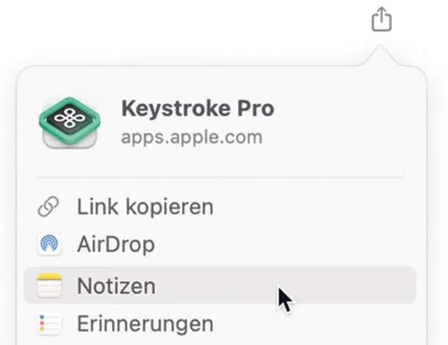 Bild 1: Das Teilen-Menü hilft sogar im Mac App Store, Apps in eine Notiz einzubinden