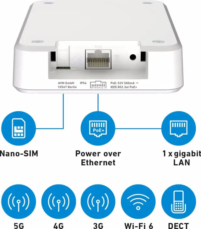 Zu den Anschlüssen gesellt sich ein Gigabit-LAN-Port für den Anschluss eines Computers oder einer Spielekonsole. Daneben gibt es noch einen RJ11-Anschluss für ein analoges Telefon. Der Nano-SIM-Slot für die entsprechende Mobilfunkkarte befindet sich auf der Unterseite der Box und komplettiert die doch eher bescheidene Anzahl an Ports respektive Anschlussmöglichkeiten. Hier hätten wir gerne einen zweiten LAN-Port oder USB-Schnittstellen gesehen. Die Stromversorgung erfolgt flexibel über Power-over-Ethernet (PoE+), ein passendes Netzteil befindet sich im Lieferumfang. Tipp: Bei Ausseninstallation kann die FRITZ!Box 6860 5G über den LAN-Anschluss am mitgelieferten PoE-Netzteil mit einem FRITZ!Repeater oder einer weiteren FRITZ!Box kombiniert werden, um die WLAN- und DECT-Versorgung im Innenbereich zu verbessern.