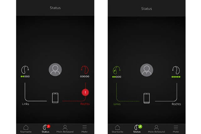 Zuerst müssen Sie am Smartphone Bluetooth aktivieren. Stellen Sie dann Ihre Hörgeräte ein. Am Anfang dauert es einen Moment, bis die App die Geräte erkennt. Erst prüfen Sie den Status (siehe Screenshot). Hier sehen Sie pro Gerät, ob eine Verbindung hergestellt wurde. Ist die Verbindung noch nicht erfolgt, zeigt dies eine rote Linie mit einem Ausrufezeichen an.