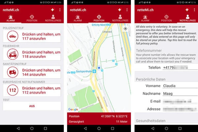 - In der App gibt es drei Tabs: Alarm, Position, Notfallpass. Im Notfall könnten Sie in der Grundansicht (Alarm) auf eine der Kacheln drücken und sie halten: Polizeinotruf (117), Feuerwehr (118), Sanitätsnotruf (144) oder die europäische Notfallnummer (112), wenn sie ausserhalb der Schweiz unterwegs sind. Die Nummer wird in der Telefon-App eingegeben, tippen Sie noch auf das Anruf-Symbol.