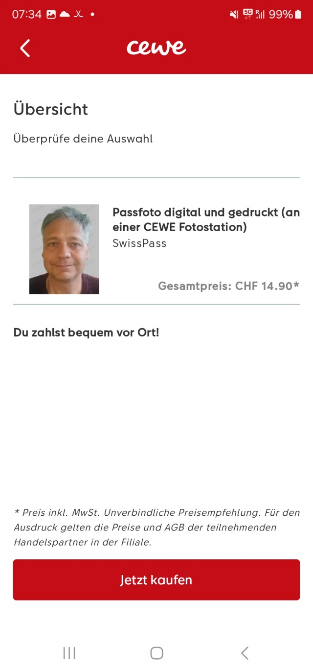 Quelle: PCtipp.chPrinzipiell möglich ist der Ausdruck am Drucker daheim oder eben in einer Cewe-Fotostation. Will man das Passfoto direkt ausdrucken, wählt man als Produkt «digitales Passfoto» für Fr. 9.-. Dabei erhält man sein hochauflösendes Foto, das man (auch noch im Nachhinein) optional an jeder Cewe-Fotostation» für nochmalige Fr. 5.90 zusätzlich ausdrucken kann. Entscheidet man sich beim Bezahlprozess für «Passfoto digital und gedruckt» (Preis: Fr. 14.90) generiert die App zusätzlich einen QR-Code, der ab sofort gültig ist. Um nun das Foto in der Filiale auszudrucken, wird eben der QR-Code dort an den Scanner der Fotostation gehalten und so eingescannt. Danach das Foto auf einem Bogen in 6-facher Ausführung ausgedruckt und bezahlt. Fertig. (Anmerkung der Redaktion: Wir haben für diesen Test und auf die beschriebene Art ein Foto für den Swisspass erfolgreich generiert, und uns dazu das Foto in der Zürcher Interdiscount-Filiale am Kalanderplatz 1 ausgedruckt.). Tipp: Möglichkeiten des Drucks an einer Fotostation gibt es in der Schweiz reichlich (z.B. Coop-, Manor-, Migros-, Interdiscount-Filiale), wobei der integrierte Filialfinder den nächstgelegenen Standort (sofern die Standortfreigabe im Handy aktiviert ist) anzeigt.