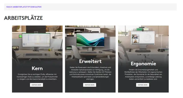 Via «Logitech for Business»-Website lassen sich Geräte nach Arbeitsplatz auswählen