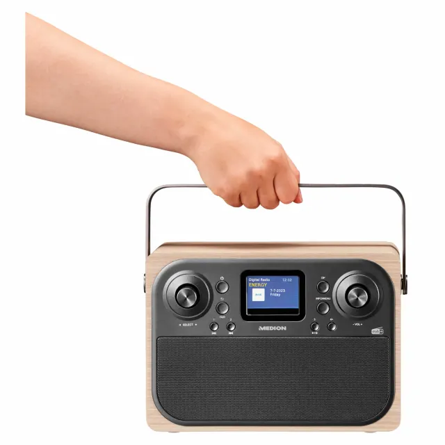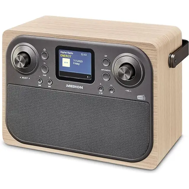 Medions Life-Modell P66700 (MD44700) kostet 55 Franken, und hat für diesen Strassenpreis viel zu bieten: Es misst 26 x 17 x 12 cm (B x H x T), wiegt rund 1,5 kg und ist zum Transport auch mit einem Rundum-Tragegriff ausgestattet. Vorne ist beim Stereo-Modell (2 x 4,5 Watt RMS) ein Farbdisplay eingelassen, welches sich zeitgesteuert dimmen, ein- oder ausschalten lässt. Auf dem Bildschirm selbst lassen sich neben dem Sendername auch weitere Informationen wie Interpreten oder auch Art der Sendung anzeigen, sofern die natürlich mitübertragen wird. Zudem verfügt das Modell insgesamt über je 30 Programmplätzen für DAB+ und UKW-Sender, eine Bluetooth-Funktion zur Soundwiedergabe via Smartphone. Ausserdem kann das Tischradio auch als Wecker eingesetzt werden. Dazu bietet es eine entsprechende Funktion einschliesslich eines Sleeptimers an. Ebenso auf der Vorderseite gibt es am linken und rechten Rand je ein grosses Drehrad. Am linken lässt sich damit im Menü navigieren, um etwa die Radiosenderliste zu öffnen oder auch die Auswahl zu bestätigen.