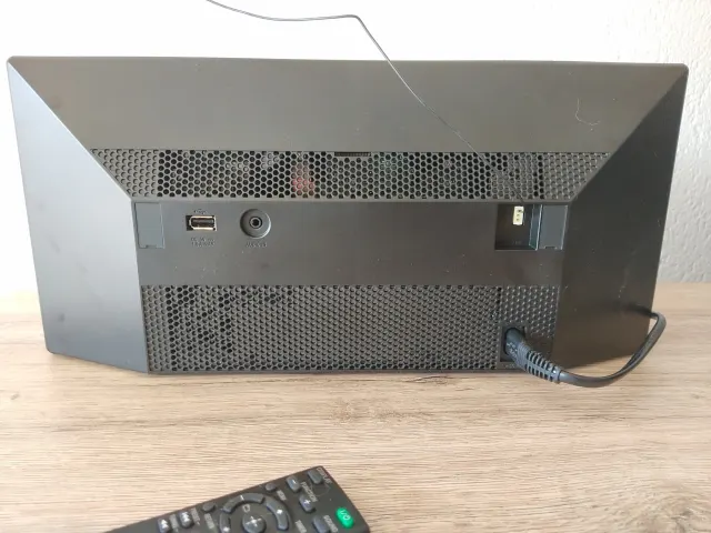 Rückseitig finden sich beim Testgerät, das uns Digitec zur Verfügung stellte, ein USB-Anschluss, eine Audio-In-Buchse, ein AC-In-Eingang (Netzkabel) und der Anschluss für die mitgelieferte FM/DAB-Antenne. Die Einrichtung des CMT-X5CDB erfolgt simpel und schnell.