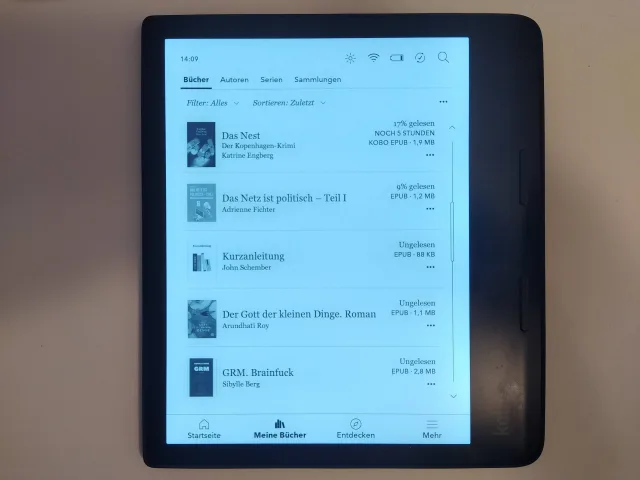 E-Book-Reader Kobo Sage: Gleicher Test-Account wie bei der Desktop-Version, hier sind allerdings noch ein paar E-Bücher mehr zu finden ...