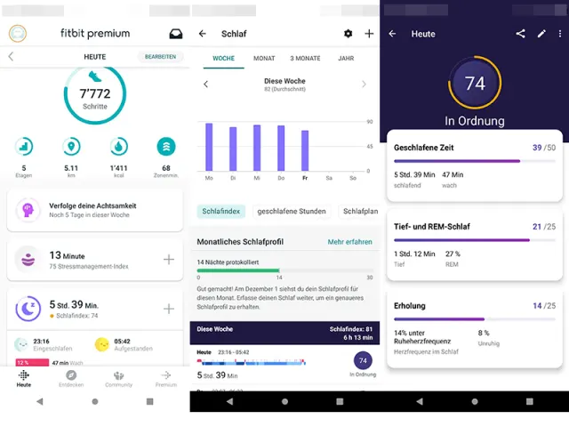 Fitbit-Geräte erfassen Ihren Schlaf. Beide Uhren zeigen die geschlafenen Stunden, errechnet einen Schlafindex und Details wie «Tief- und REM-Schlaf», «Erholung» sowie «geschlafene Zeit», und wenn die Uhr einen Monat nachts getragen wird, sehen Sie ein monatliches Schlafprofil. Das hat die Autorin im Test leider nicht geschafft.