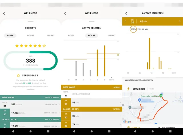 Es gibt übrigens eine automatische Workout-Erkennung. Nach ein wenig Suchen (Hamburgermenü/Wellness) findet man auch die Einstellungen dazu, um diese anzupassen. Im Test wurde nur jene für Spazieren verwendet. Diese hätte nach 10 Minuten ein Training automatisch erkennen und nachfragen müssen. Das ist aber während mehrerer Wochen nie passiert. Manuell gestartet, funktionierte das Training zuverlässig.