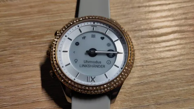 Das Testgerät kommt in der schicken Damenvariante Stella Silikon Grau. Das erhaltene Modell der Hybriduhr sieht auf den ersten Blick sehr klassisch und elegant aus. Erst auf den zweiten fällt das smarte Display auf.