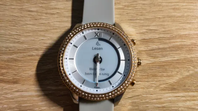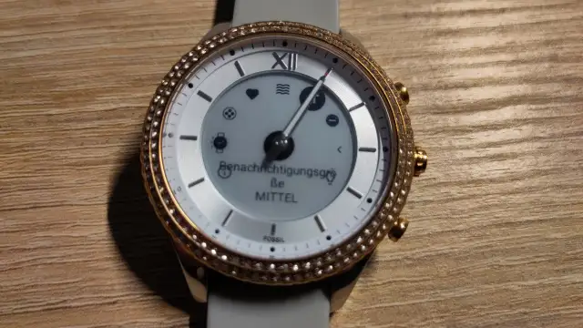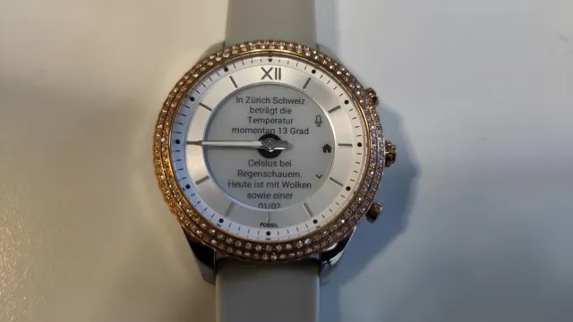 Quelle: FossilEtwas gewagt finde ich beim Testmodell die Farbenkombination, da Silber mit Roségold gemischt wird. Da ist zum einen das silberfarbene Edelstahl-Gehäuse, um das Zifferblatt herum eine zweistufige, roségoldfarbene Einfassung mit Glassteinchen und etwas erhöht – um das smarte E-Ink-Display herum – ein klassisches, elfenbeinfarbenes Zifferblatt. Too much fand ich dann, dass die Tasten auf der rechten Gehäuseseite ebenfalls roségoldfarben gehalten sind. Im Kontrast zum (silbernen) Edelstahlgehäuse sieht dies etwas Fremdkörper-mässig aus. Doch, wie üblich, ist dies Geschmackssache und es gibt ja verschiedene Designs.