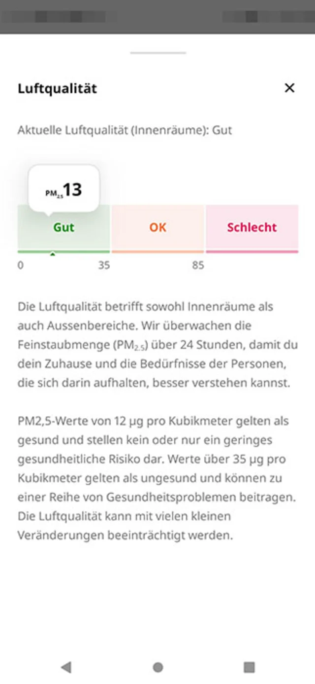 In den Details zu Starkvind finden Sie den Bereich mit dem PM2,5-Wert. Tippen Sie darauf, um Details zu sehen. Sie sehen den aktuellen Luftqualitätswert in Ihrem Raum und eine Bewertung wie Gut. Ausserdem erfahren Sie mehr über die Feinstaubmenge (PM2,5).