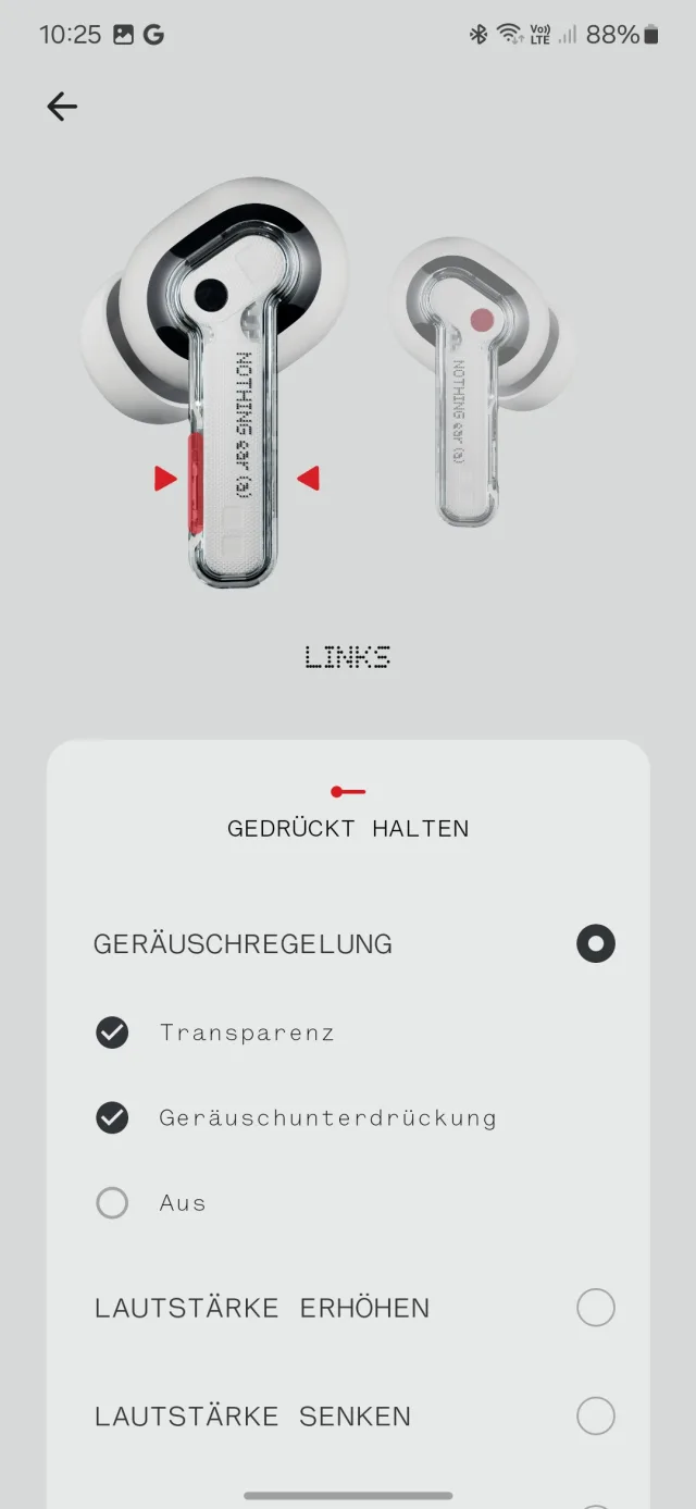 Quelle: NothingDie Bedienung der beiden Kopfhörer ist genauso durchdacht wie die Einrichtung. Es gibt einen Druckknopf an den Ohrhörern. Über diesen lassen sich alle wichtigen Aktionen wie Lautstärke, Geräuschunterdrückung, Start/Pause etc. steuern. Anfangs ist das Ertasten der Knöpfe etwas fummelig, aber nach kurzer Zeit hat man deren Position verinnerlicht. Clever: Die Knöpfe lassen sich via Nothing-X-App beliebig «umprogrammieren».