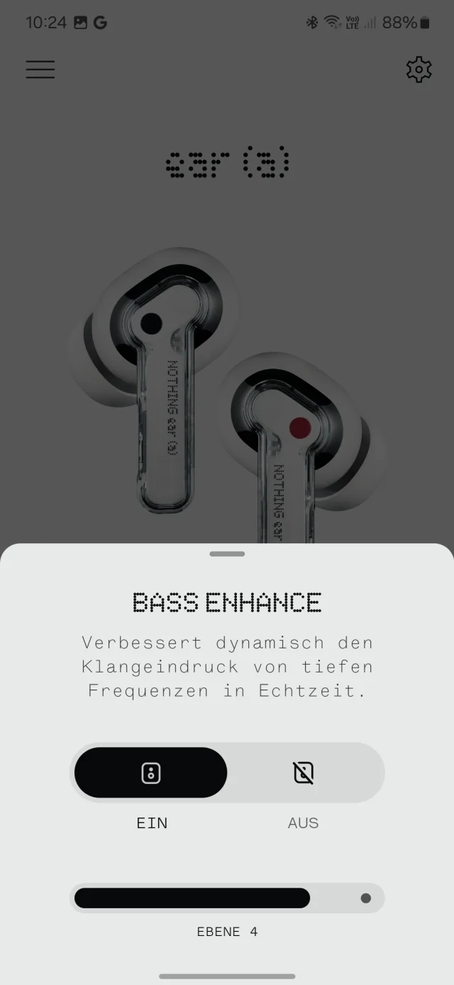 Quelle: NothingBezüglich Sound hatte ich bei den Nothing-Kopfhörern keine grossen Erwartungen … und wurde sehr positiv überrascht. Bereits der Kleine überzeugt mit einem druckvollen, schönen Bass. Er hat eine bassbetonte Signatur. Mitten und Höhen sind aber harmonisch eingebunden, wenn auch nicht besonders detailliert. Denn Höhen fehlt zudem die Brillanz und das Luftige; sie neigen ausserdem etwas zu Zischlauten. Dennoch: Der Sound ist rund und euphorisch. Das Hören mit dem Ear (a) macht Spass – über alle Genres hinweg.