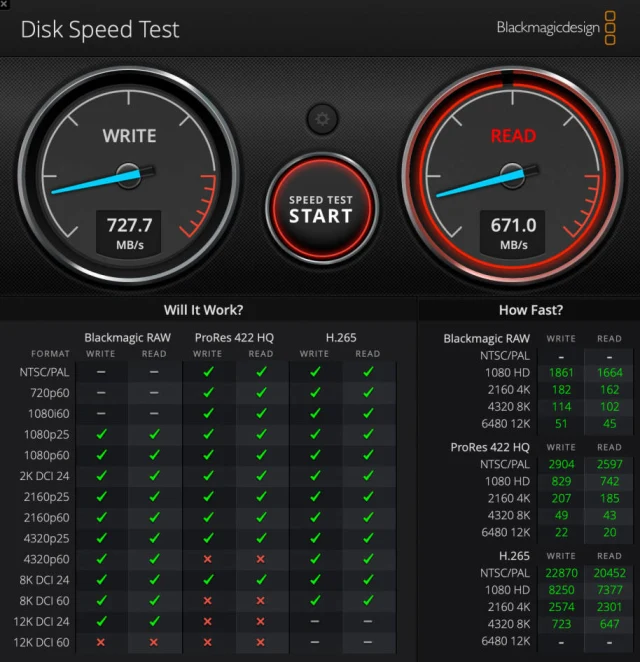 Wir haben die Lese- und Schreib-Geschwindigkeit der T7 Shield mit der Software Blackmagic Disk Speed Test getestet (macOS Monterey), mit einem 1 GB grossen Testpaket – die Resultate bewegten sich stets zwischen 700 und 750 MB/s beim Schreiben und Lesen. Solide Werte, auch wenn sie beim Dauertest dann auf circa 650 bzw. 680 und etwas weiter sanken.