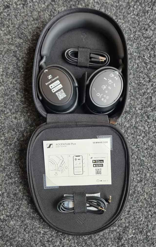 Quelle: SennheiserAusserdem gibt es am rechten Hörer neu eine Klinkenbuchse, um den Kopfhörer per Klinkenkabel mit einer Audioquelle zu verbinden. Das Kabel liegt bei; genauso ein USB-C-Ladekabel. Ebenfalls ein Ausstattungsplus ist die Tragtasche, die beim ersten Accentum fehlte.