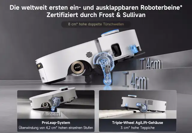 Die Steighöhe des Dreame Aqua10 Ultra Roller beträgt bis zu 8 cm (Doppelstufe)