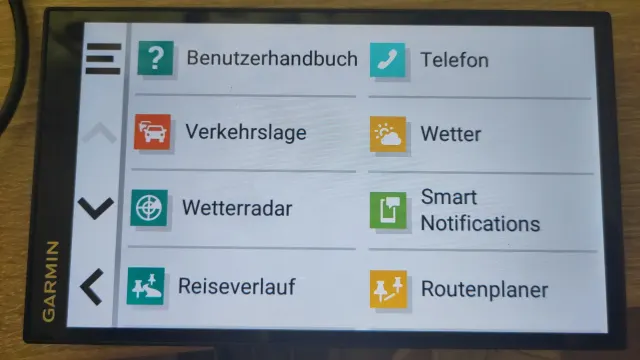 In der Grundansicht des Navis sehen Sie unter andrem den Menüpunkt Apps. Dort finden Sie das Benutzerhandbuch, Verkehrslage, Wetterradar, Reiseverlauf, Telefon, Wetter, Smart Notifications und Routenplaner, Drahtlose Kameras und OK Garmin.