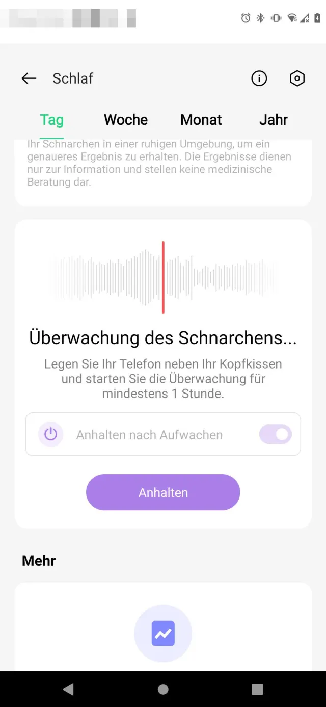 Quelle: Screenshot/PCtipp.chErwähnenswert ist auch die Schnarchrisikobewertung. Damit die Oppo-Uhr eine Schnarchüberwachung tätigen kann, muss die entsprechende Funktion in der HeyTap-Health-App manuell aktiviert und jeweils gestartet werden. Die App greift anschliessend auf das Smartphone-Mikrofon zu. Die Messung wird vor dem Schlafengehen manuell via Handy-App gestartet, anschliessend legt man das Smartphone neben sich. Ganz lustig, um das mal auszuprobieren und die Neugierde zu stillen, aber praktisch für eine regelmässige Überwachung ist dies meiner Meinung nach nicht.