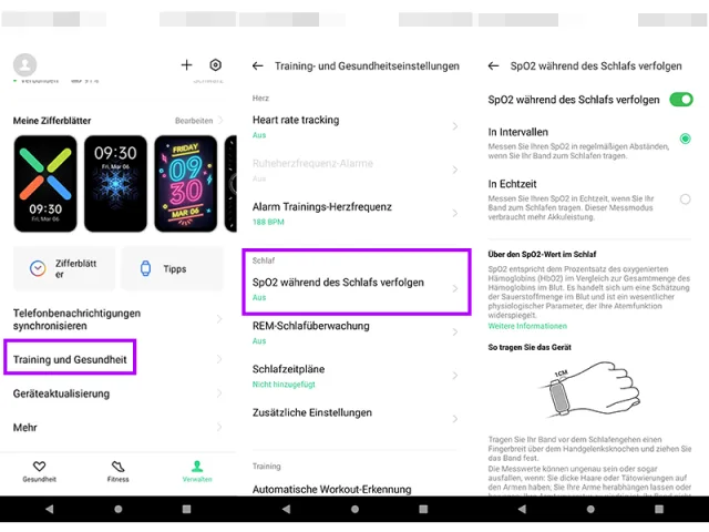 Sie können mit der Oppo Watch Free manuell sowohl die Sauerstoffsättigung (SpO2) als auch die Herzfrequenz messen. Damit der SpO2-Wert aber auch nachts automatisch gemessen wird, müssen Sie einen kurzen Ausflug in die App-Einstellungen machen (hier erklärt). Wenn diese Funktion aktiviert ist, wird den ganzen Tag automatisch der SpO2-Wert gemessen – was sich auf die Akkulaufzeit auswirken wird.