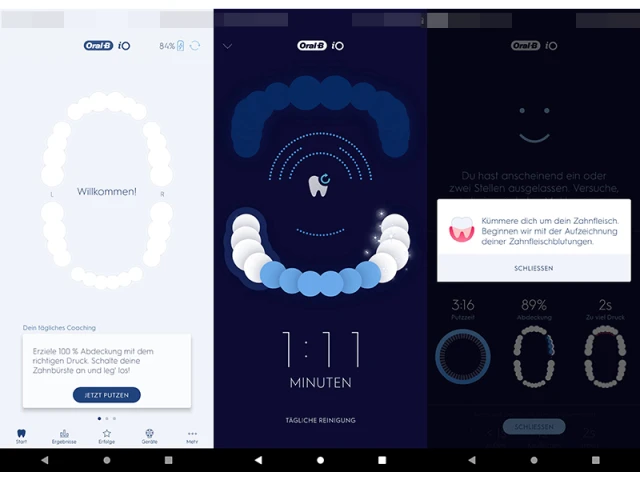 Wie man seine Zähne putzen soll, erfährt man einerseits auf der elektrischen Zahnbürste via interaktives Farb-Display oder Lichtring. Letzterer leuchtet grün, wenn der Druck optimal ist und warnt in roter Farbe, wenn zu fest gedrückt wird. Alternativ erhält man eine Anleitung von der neuen (magnetischen) iOSense-Ladestation. Mehrere Lichtstreifen (LED-Leuchten), die kreisförmig angeordnet sind, stellen quasi Ober- und Unterkiefer dar und zeigen, wo man gerade putzt und ob man schon fertig ist. Auch sie warnen in roter Farbe, wenn man zu stark drückt. Eine Digitalanzeige auf dem Rand misst die Zeit, damit man die drei Minuten, die man ja artig putzen soll, nicht unterschreitet. Der dritte Weg geht über die Oral-B-App.