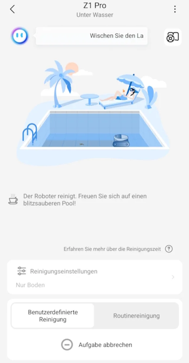 Zunächst widmete sich der Roboter der Bodenreinigung, die eine Dauer von etwa 29 Minuten in Anspruch nahm. Wichtig dabei: Bevor der Z1 Pro mit der eigentlichen Reinigung beginnt, vermisst er das Becken, um danach zu entscheiden, auf welche Art er das Becken (via Bahnen, zonenabhängig oder «S»-förmig) reinigt. Dies geschieht, indem er einmal das gesamte Becken abfährt, was etwa 3 Minuten dauerte. Anschliessend legte er systematisch los.In unserem Fall entschied er sich für die bahnenweise Reinigung des Poolbodens. Die Leistung während der Bodenreinigung war schlichtweg beeindruckend. Der Roboter liess nichts aus und fuhr äusserst zuverlässig, bis auf den Millimeterbereich an den Beckenrand heran. Präzise und elegant, quasi ein Unterwasserballett. Selbst in den engen Radien des ovalen Beckens meisterte er die Herausforderung mit Bravour. Daneben erkannte der Poolroboter auch unsere Leiter als Hindernis und umfuhr diese. Das Ergebnis: ein schmutz- und ablagerungsfreier Beckenboden.