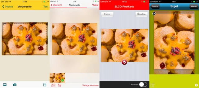 Die vier getesteten Apps: PostCard Creator, Ifolor Feriengruss, Elco Postkarte und app2print (v.l.n.r.)