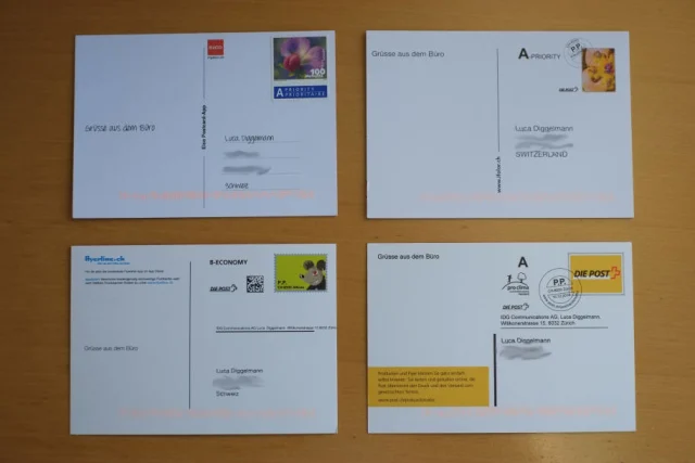 Die Postkarten von Elco (oben links), Ifolor (oben rechts), Flyerline (unten links) und der Post (unten rechts)