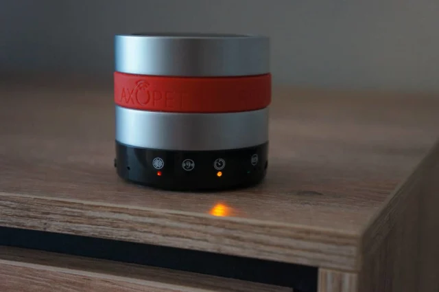Quelle: RelaxoPetDas Pro-Modell hat mehr Tasten und LED-Anzeigen als das Vorgängermodell. Steht das Gerät z.B. auf einem Tisch, finden sich seitlich jeweils eine Taste für Lauter und Leiser und dazwischen eine für «Pause/Play». Links und rechts davon finden Sie Symbole mit jeweils einer LED darunter (Details siehe weiter unten).