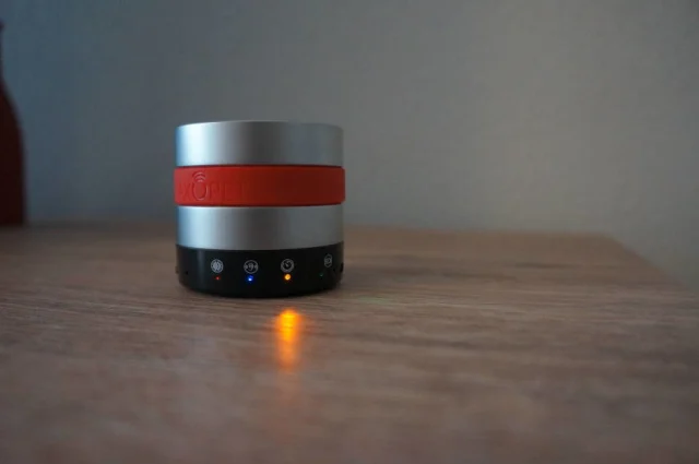 Oben am Gerät befindet sich ein Lautsprecher bzw. das Soundmodul. Im schwarzen Bereich (seitlich) finden Sie drei Tasten, mehrere Symbole mit LEDs sowie zwei Mikrofone. Ausserdem befindet sich der Micro-USB-Anschluss fürs Aufladen hier.Tasten