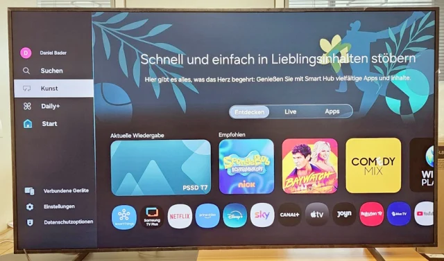 Quelle: PCtippSchlankes Betriebssystem, schnelle Bedienung: Das Betriebssystem basiert auf Samsungs bekannter Tizen-Plattform und bietet seine typische, übersichtliche Benutzeroberfläche. Die Navigation durch Menüs und Apps ist flüssig. Apps für gängige Streaming-Dienste (Netflix, Disney+, Prime etc.) sind vorinstalliert und können schnell aufgerufen werden. Die Bedienung erfolgt über die mitgelieferte Fernbedienung, die schlank gestaltet ist und über die wichtigsten Tasten verfügt. Zudem bietet der Steuerknüppel, auf seiner Rückseite, die bekannte Solaraufladefunktion. Selbstverständlich integriert der Hersteller auch seine Sprachsteuerungsfunktionen in den TV. Klasse: Samsung bietet für das Gerät einen 7 Jahre langen Support für Tizen-OS-Updates.