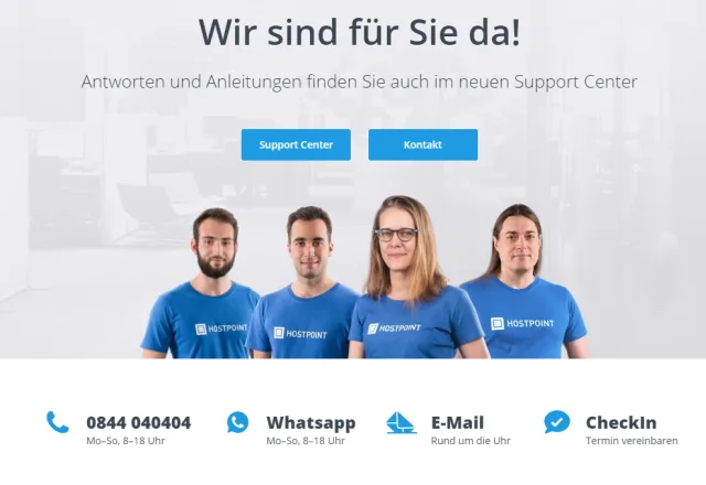 Unter Customer Care laufen alle Fäden für den Support zusammen, der Hersteller glänzt dort mit geballtem Know-how. Hier kann man Hostpoint per Anruf, E-Mail, WhatsApp, Skype oder via Webseiten-Formular kontaktieren. Zudem können Kunden per Check-in direkt einen Termin buchen und mit einem Customer-Care-Agent sprechen.