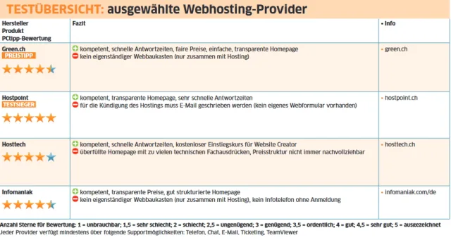Der Test zeigt: Support ist alles andere als ein Selbstläufer. Supportleistungen zahlen sich immer dann aus, wenn sie möglichst auf vielen Wegen, dabei aber einfach, schnell und verständlich zum Kunden, sprich Anwender gelangen. Dabei spielt vieles eine wichtige Rolle: Schnell ersichtliche Supportleistungen, eine möglichst lange Erreichbarkeit der Telefon-Hotline/des Mail-Supports rund um die Uhr bis hin zu einem Social-Media-Kanal, der auch tatsächlich zur Kontaktaufnahme einlädt, und, und, und.Unterm Strich können wir hier allen vier getesteten Hostern gute bis ausgezeichnete Supportnoten vergeben. Die Poleposition hat der Provider Hostpoint inne, unser Preis-Leistungs-Favorit ist Green.ch. Während Green.ch über eine sehr ordentliche Supportleistung zu fairen Preisen sowie eine einfach gestrickte, transparente Webseite verfügt, die alle Dienste sauber bündelt, überzeugt unser Testsieger Hostpoint mit ausserordentlichen Supportzeiten sowie grosszügiger und kompetenter Hilfe, die deutlich über dem Soll liegt.