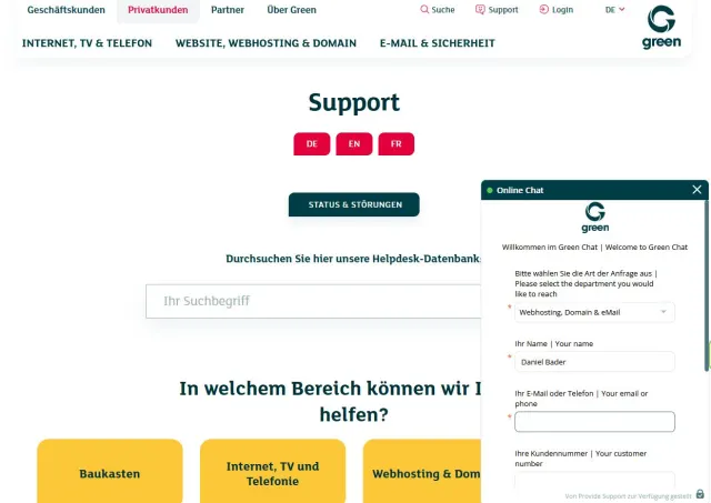 Green.ch ist ein Unternehmen, das Hosting-Dienstleistungen für Privat- und Geschäftskunden bereithält. In dieser Kaufberatung stehen allerdings die Supportleistungen für Privatanwender im Fokus. Und die, soviel vorweg, können sich sehen lassen. Klickt man auf der Startseite von green.ch auf den Privatkunden-Button, zeigt sich gleich die Stärke des Hosters.