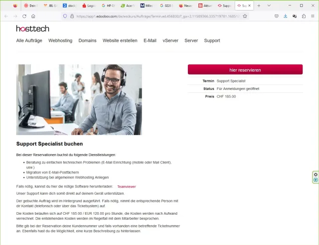 Quelle: Screenshot: PCtippDie Fülle der Serviceleistungen ist top: Hilfeleistungen gibts von Spezialisten bei Problemen rund um E-Mails, Migrationen, Managed Server, CMS-Systeme, den Website-Creator-Baukasten (WCS) oder auch zum Datencenter. Allerdings ist das Ganze nicht kostenlos: Will man etwa einen WCS-Spezialisten buchen, werden 185 Franken pro Stunde fällig. Kunden, die in Euro zahlen, fahren mit 120 Euro deutlich günstiger … wieso auch immer. Gut gefallen kann wiederum die angebotene Fernwartung, die Hosttech seinen Kundinnen und Kunden offeriert: Hier gibts eine feine Schritt-für-Schritt-Anleitung, und zwar für PCs wie auch Smartphones. Bei unserem Supporttest haben wir mit einem Mitarbeiter bezüglich des Website-Creator-Tools gechattet. Der Chat startete unverzüglich beim Erstellen unserer Test-Homepage respektive bei der Auswahl des Designs. Er konnte uns sowohl bei technischen Fragen (Vorschläge zum Webseitendesign, Domainaufschaltung, Module zum Erstellen einer Webseite) als auch der Preisstruktur zuverlässig Auskunft geben. Daumen hoch.